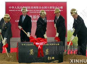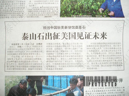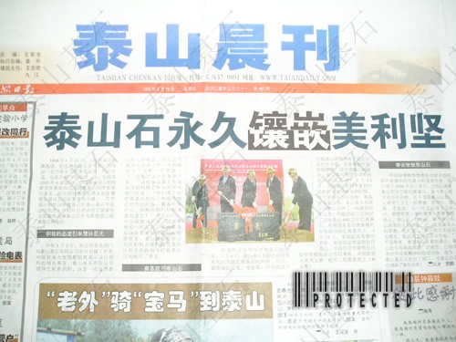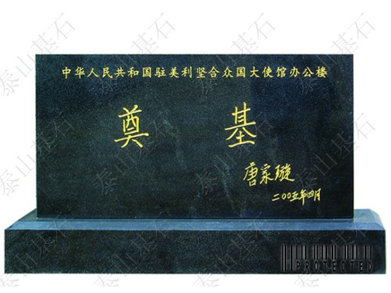 2005年4月22日,中國駐美國大使館新館舍奠基儀式隆重舉行,儀式上的奠基石就來自泰安,并且這塊奠基石將永遠被鑲嵌在建成后的駐美使館大樓上。巧合的是,47年前的這一天--1958年4月22日,人民英雄紀念碑落成,紀念碑的基石選用的就是泰山花崗巖。今年3月2日,我國外交部首次與泰安有關部門對接了有關中國駐美大使館新館舍奠基石設計制作的相關事宜,根據(jù)外交部領導對奠基石的要求,泰山基石公司在第一時間將設計思路通過網(wǎng)絡傳給了遠在北京的外交部,經(jīng)批準后,公司精心選擇了一塊泰山青,用最好的工匠,用一個星期就做好了這塊重達600公斤的奠基石,并高標準地將國務委員唐家璇的親筆題詞刻在奠基石上。在奠基儀式上,中美政要及華裔著名建筑設計師貝聿明為工程奠基培土,外交部領導對公司提供的奠基石非常滿意。 中國駐美大使館將是我國目前在國外規(guī)模最大館舍,預計將于2008年投入使用。之所以選用泰山石為工程的奠基石,是與泰山的文化分不開的?鬃拥桥R泰山以后,歷代文人墨客登泰山抒壯志,賦予泰山石以深厚的文化內涵。北京天安門廣場、人民英雄紀念碑、人民大會堂的基石都特意選用了泰山花崗巖,象征著穩(wěn)如泰山。千百年來,泰山已成為中華民族精神的組成內容。
